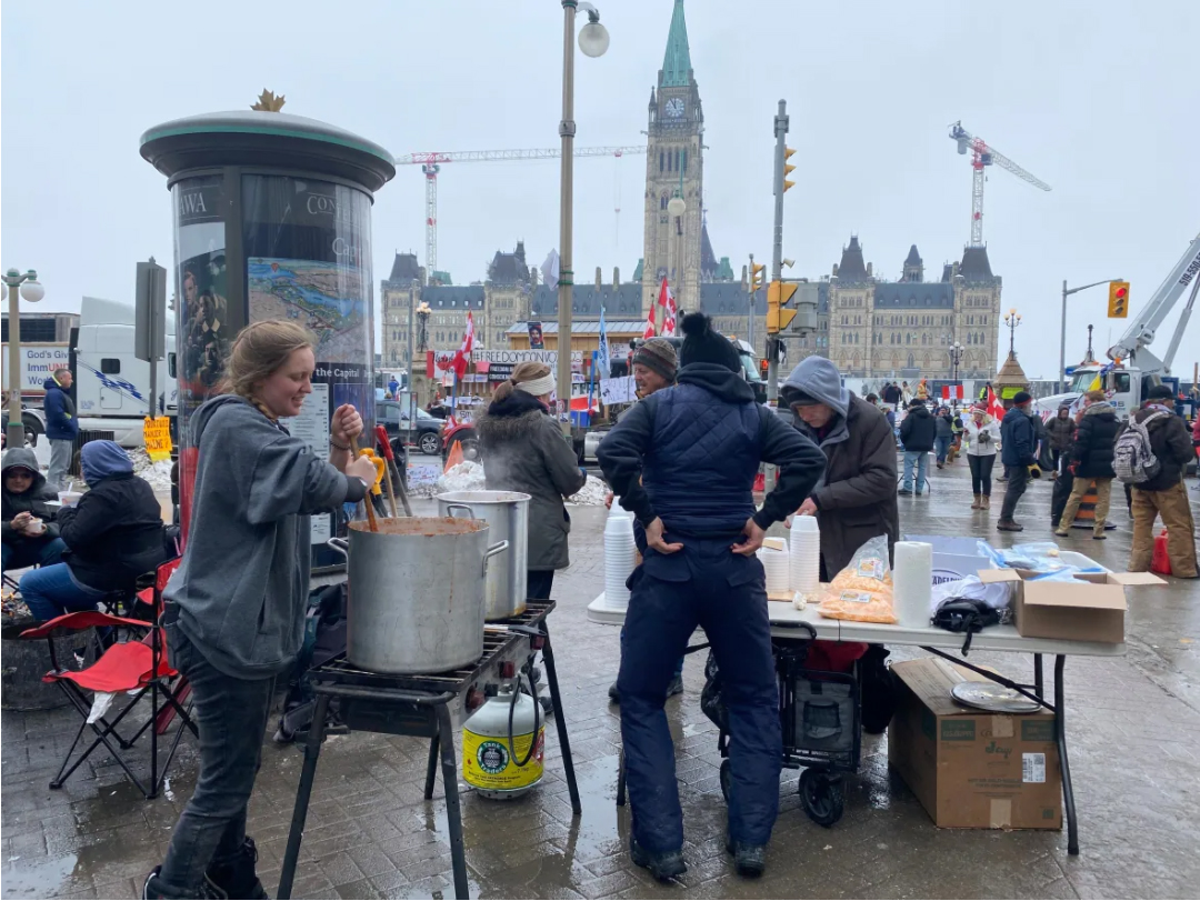 2022 年 2 月 8 日,在政府划定的渥太华国会山前的抗议“红区”里,人民自力更生、丰衣足食。
