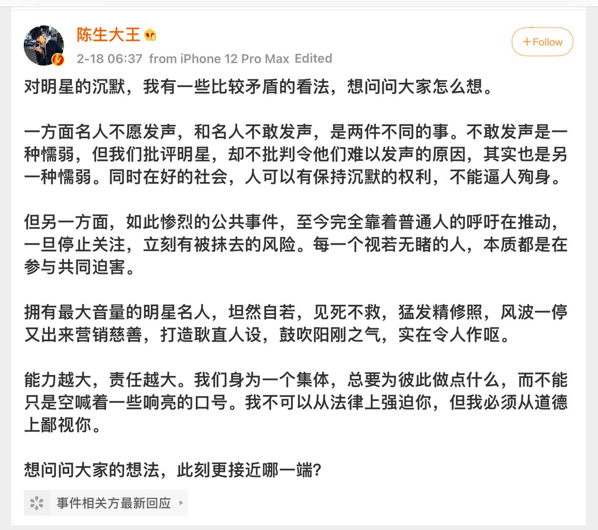 明星也就是大颗的韭菜,既被上面通报式收割批判,又被下面破鼓万人捶,就在这条微博下面还有人在骂姚晨袁立,除了甜菊表忠心谁敢提什么时政呢?一般人炸个号,明星则可能整个演艺事业完蛋。