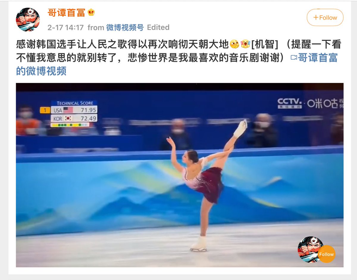 韩国选手配的音乐是你可听到人民歌唱,有点定点辱的感觉。