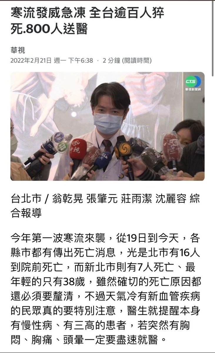 吓人啊!仅台湾一个倒春寒就能瘁死逾百人,近800人就医, 在中共国天气寒冷的东北、西北毒苗发病率肯定更严重!目前毒苗次生灾难还没正式开始,等到寒冷的秋冬季毒苗大发作时,那得多恐怖啊?