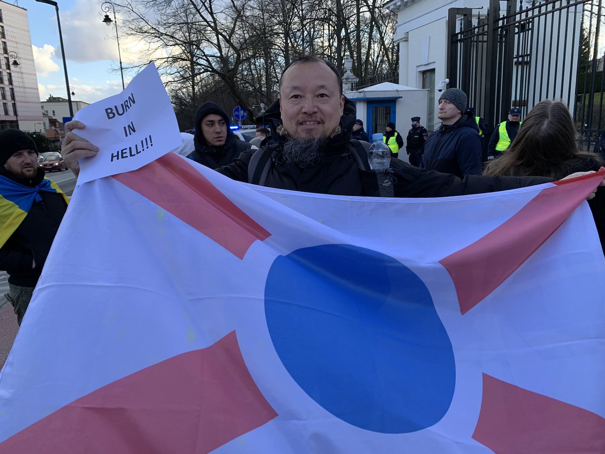 25日在波兰首都华沙俄罗斯驻波兰大使馆前,参加反对俄罗斯侵略乌克兰的抗议示威活动。向示威者介绍上海国旗。 #上海独立