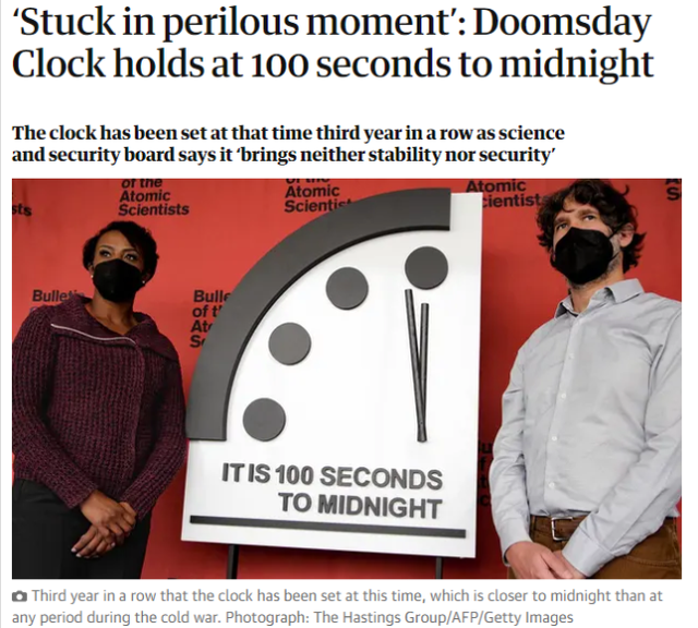 根据我有限的知识,一旦某国家威胁使用核武,或者将部分核武调整到可发射状态,那就意味着全球范围内的所有拥核国家都会调整自己的警戒等级。我们这代人亲眼看到热核战争的风险越来越高了。图为“末日时钟”。