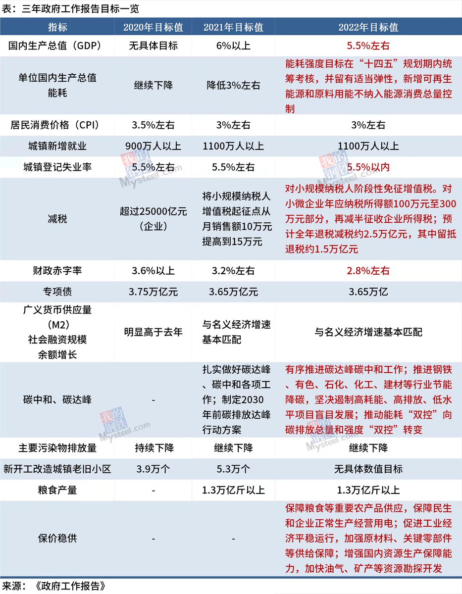 2020-2022年中国政府工作目标对比今年一季度大宗强势,在目标3%通胀的背景下,原油铁矿煤炭加上最近的粮食谷物油料的行情迫使政府增加更多“保价稳供”的细分目标。
