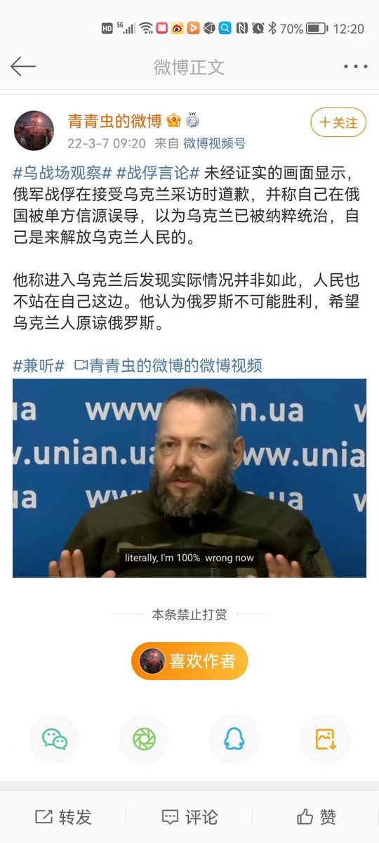 俄罗斯战俘接受乌克兰采访时道歉,称自己在俄国单方信源误导,以为乌克兰被纳粹统治,自己来解放乌克兰人呢,他进入乌克兰,发现完全是谎言。洗脑过程都一个套路!