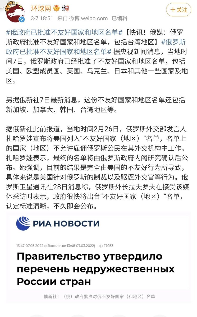 俄国政府把台湾列入“不友好国家”,《环球时报》不仅不敢骂,还要替其精神祖国擦屁股,给补上“(和地区)”。