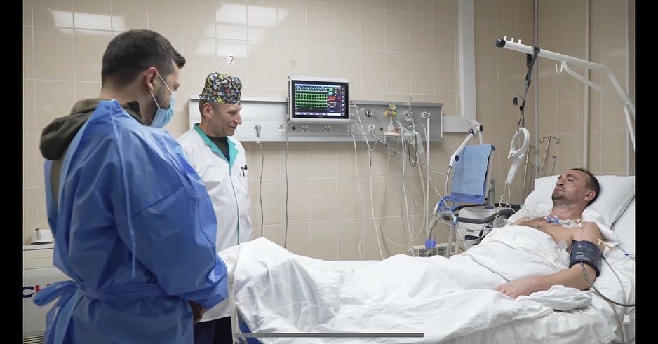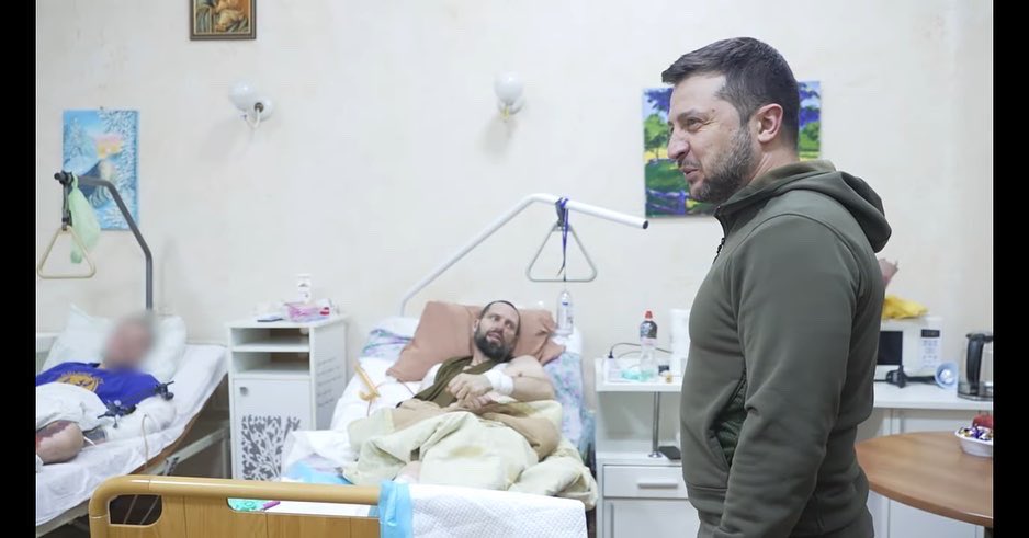 乌克兰总统泽连斯基在医院看望受伤的乌克兰卫士。
