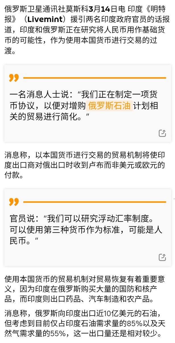 印度和俄罗斯正在研究将人民币用作基础货币的可能性,作为使用本国货币进行交易的过渡。与此同时,美国代表团在罗马会晤上警告中共政府,若在乌克兰问题上支持俄罗斯将面临的后果。