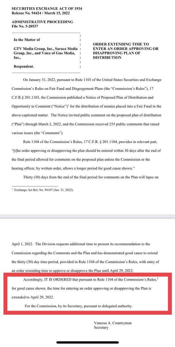 SEC对GTV投资人分配方案草案的公开征集意见延期至4月29日。还没有来得及提建议和意见的受害者,特别是国内往魏丽红个人账户汇款以及第三方汇款的受害者,这是你发声和维权的最后窗口期了!能不能最大程度地拿回你的钱,就看大家的行动了!