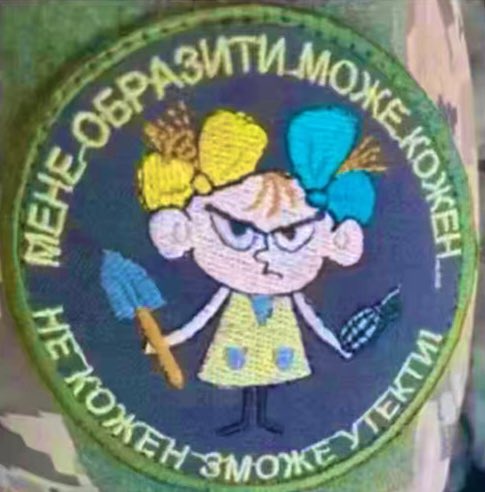 乌克兰女兵的臂章,上边的文字是:“欺负我的人,一个也跑不了!” 头戴国旗颜色的发带,左手拿个雷,右手拿个铲!管杀还管埋,奶凶奶凶的! 粉蛆们,为了你俄爹的伟大事业,快冲上去吧!