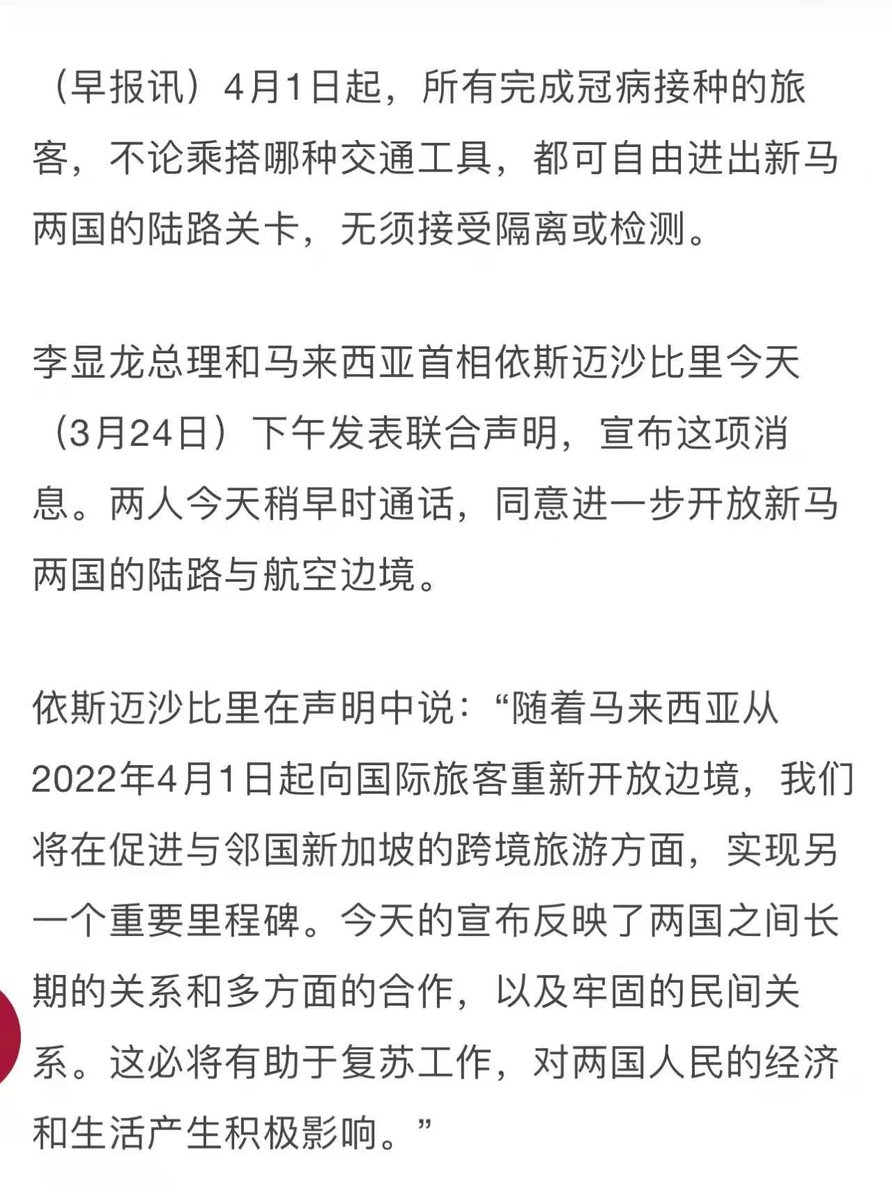 #新加坡4月1日起新马关口全线开放,只要接种过疫苗,不用任何检测和隔离自由进出。新马关口关闭是2020年4月,整整两年过去了。