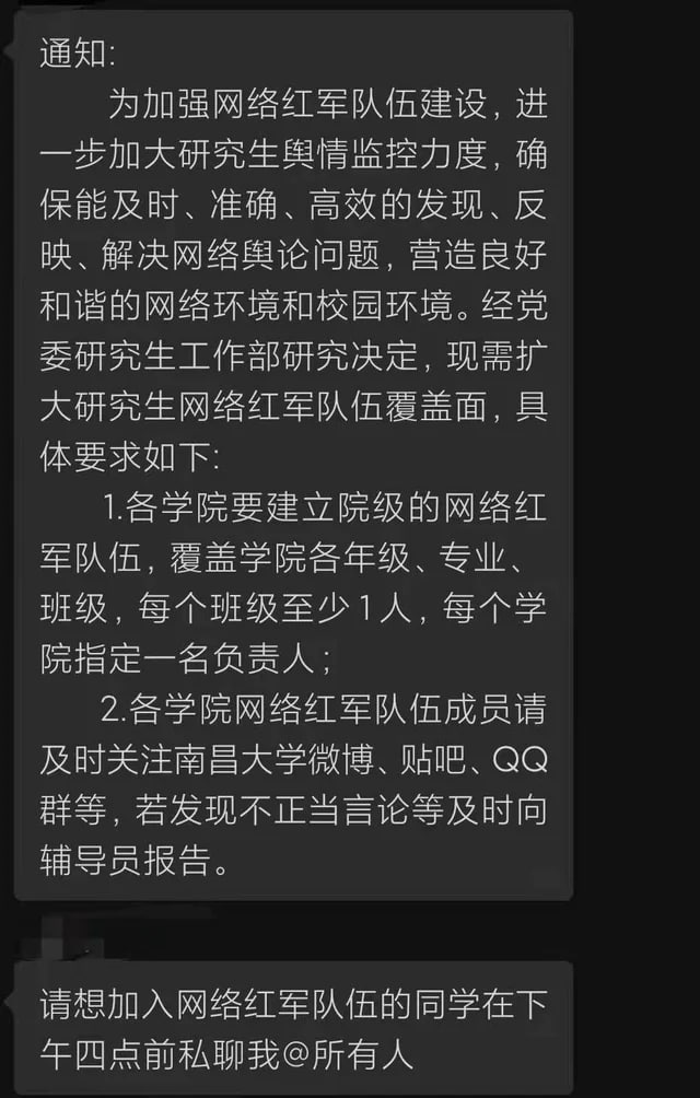 南昌大学:加强“网络红军”队伍建设,每班至少派出一人,发现学校相关论坛出现不当言论便立马举报。中国大学并不致力于培养有智识、有创造力的人,但致力于培养乖乖听话的人。韭菜越精明,就越是祖国的负资产。