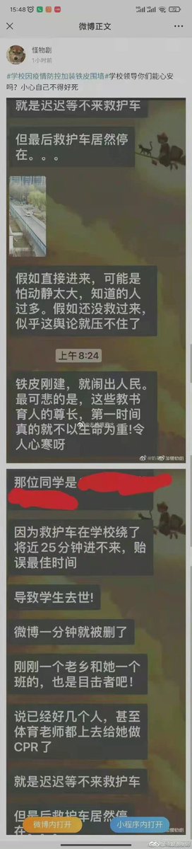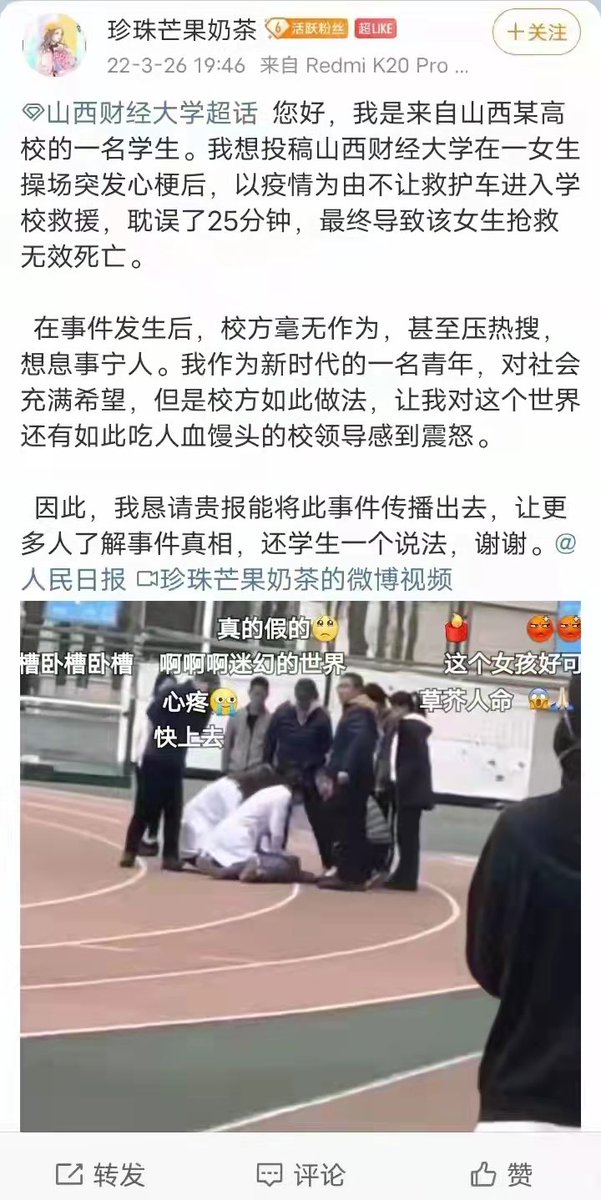 山西财经大学一名女生在操场突发心梗,救护车因疫情管控进不了学校,医生只能带着仪器和担架跑步进校,耽误了25分钟,抢救无效死亡。