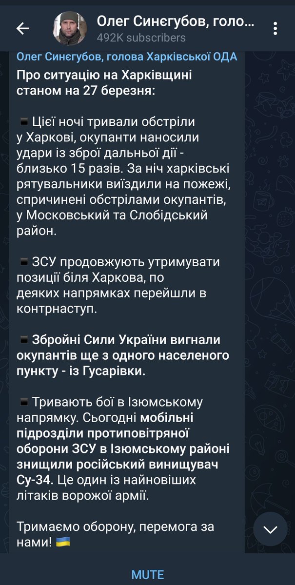 乌克兰哈尔科夫地区军事管理局局长奥列格·西涅古波夫在Telegram上发表声明称,乌克兰军队今天在伊齐乌姆附近击落了一架俄罗斯的 Su-34 飞机。这是俄罗斯最先进前线战斗轰炸机。