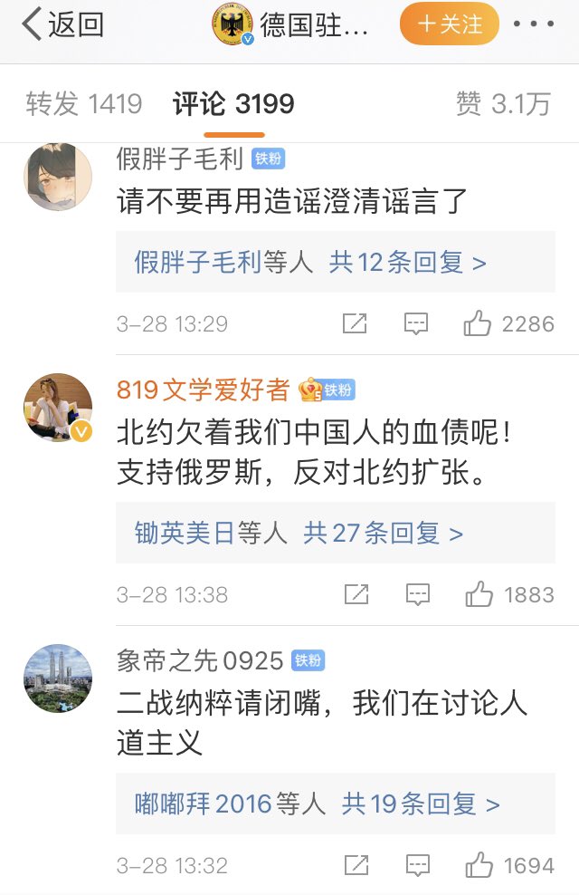 德国驻华使馆发文澄清北约不东扩的谣言,底下的评论都在骂他们是纳粹。
