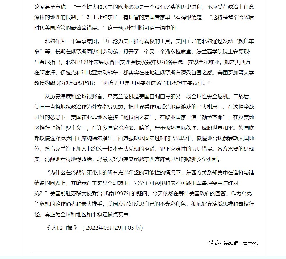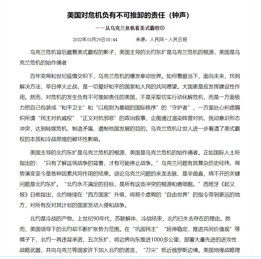 如此严厉的文章居然放在第三版,这不像要宣战的风格啊,不宣战却又指责美国和北约要为俄国入侵乌克兰负责,公然为俄国站台,难道是为美国制裁中国提供理由?中共首鼠两端,习近平一味要强,又不敢硬扛美国的心态跃然纸上。