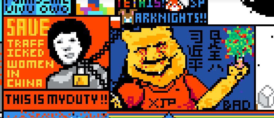 r/place 现场速报现在恶魔维尼右手拿病毒,左手牵8孩母亲铁链女和阿米娅#像素大战