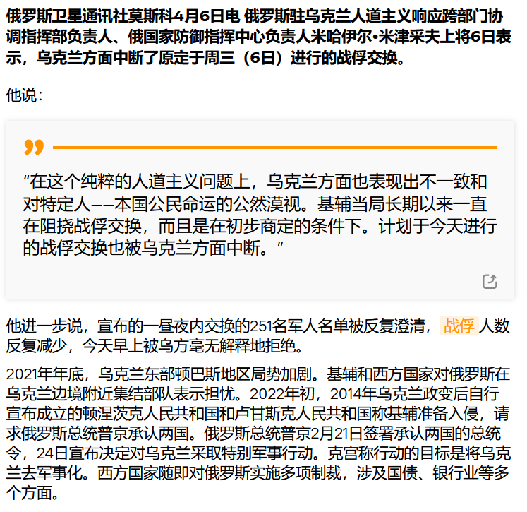 俄国防部:乌克兰中断原定于周三进行的战俘交换