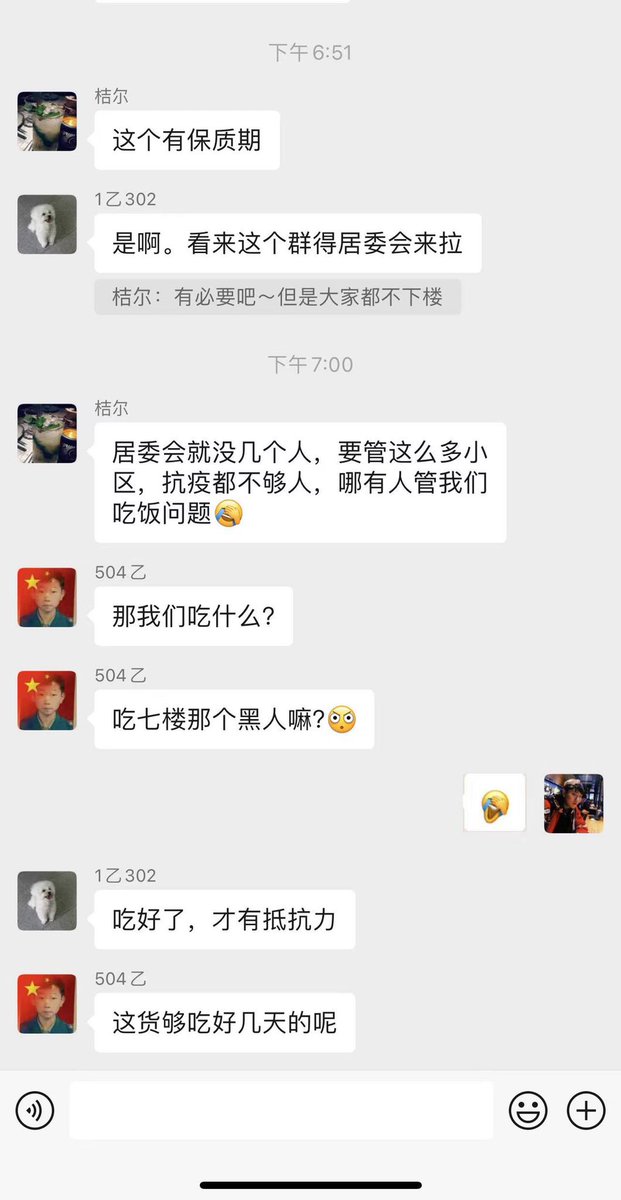 上海某小区,邻居群里有人戏称要吃7楼那个黑人。谁知他本人也在群里,他说:“我是个好黑人,请不要吃我”。哈哈哈