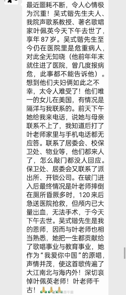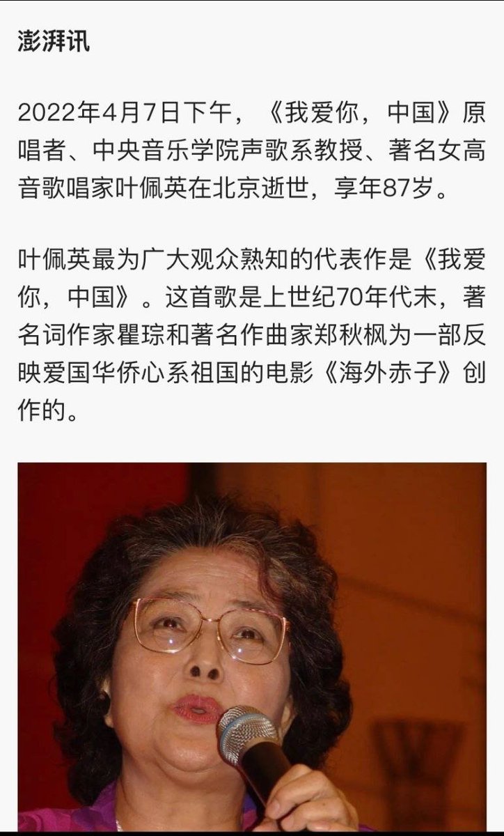 《我爱你,中国》的原唱叶佩英,因小区封锁医治不及时死亡。死得其所。