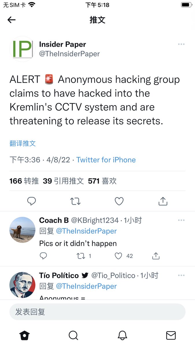 匿名黑客组织声称已经侵入了克里姆林宫的闭路电视系统,并威胁要泄露其机密。喵评:若将共匪和普京勾兑的秘密曝出来,那该多热闹