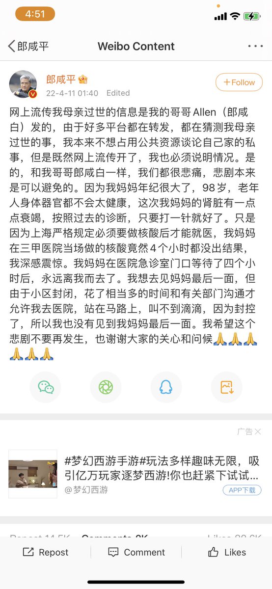 郎咸平母亲因为新冠防疫而去世。上海新冠Omicron总共20万例,1重症,0死亡。而封城和防疫导致无法救治、自杀和突发疾病导致死亡估计接近四位数了。