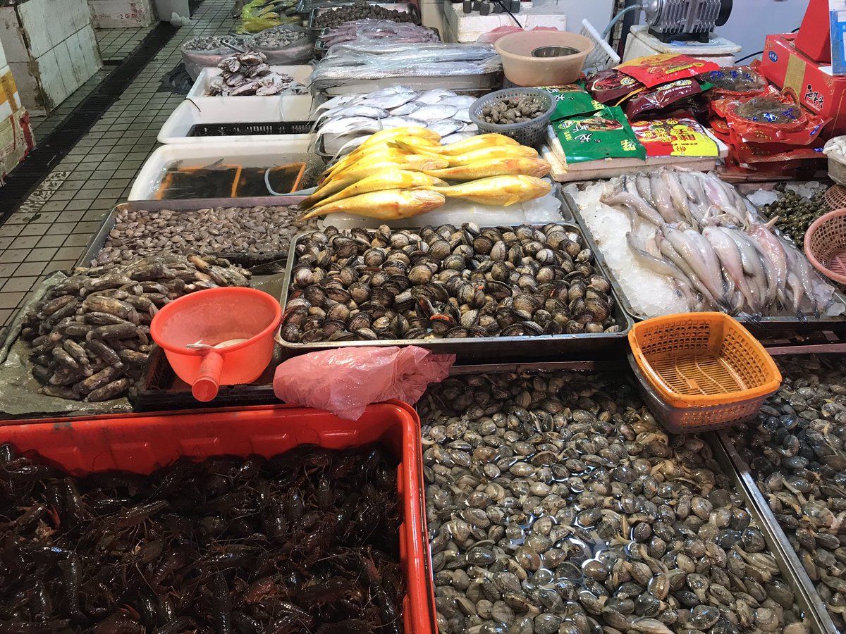 福建延平。本地黄牛肉,牛腩40元里脊肉50元。图二蒸熟的巴浪鱼12元,巴浪鱼咸鱼干很好吃,油煎下酒喝粥。图三烟熏味的腊肉38元一斤,鸭子68元一只。新鲜的黄鱼和蛏子都是20元一斤。
