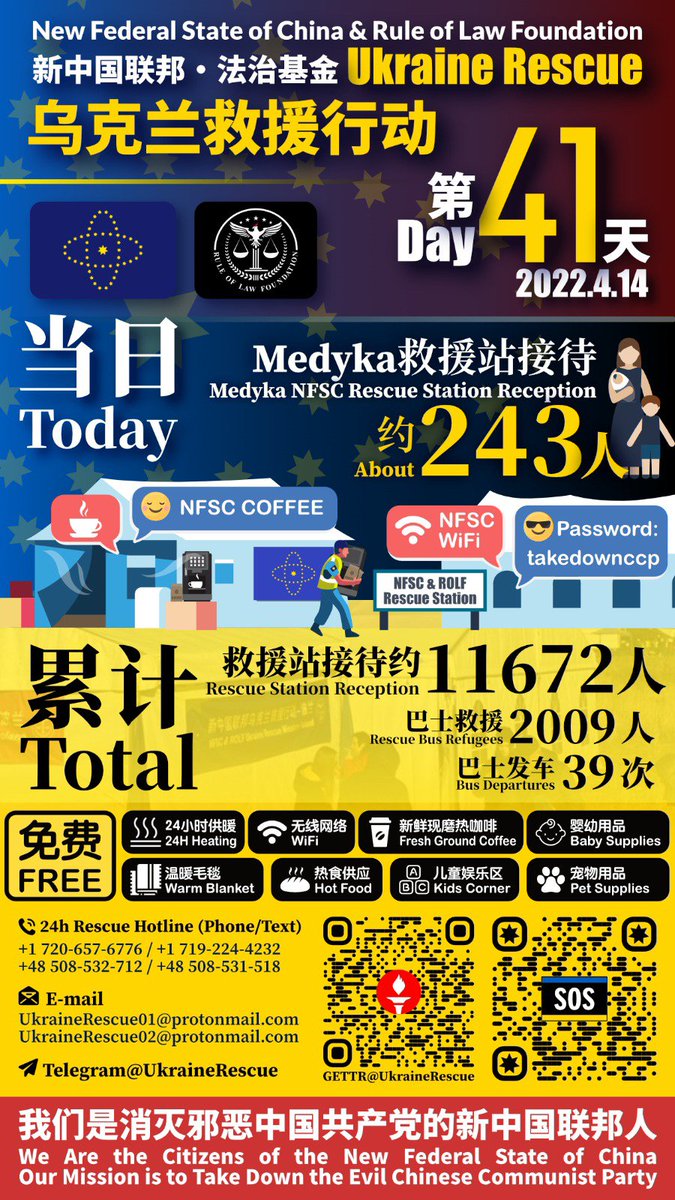 新中国联邦·法治基金——乌克兰救援行动报告2022年4月14日第41天当日救援统计:Medyka救援站接待:约243人累计救援总计:Medyka救援站接待:约11672人巴士救援难民:2009人巴士发车:39次