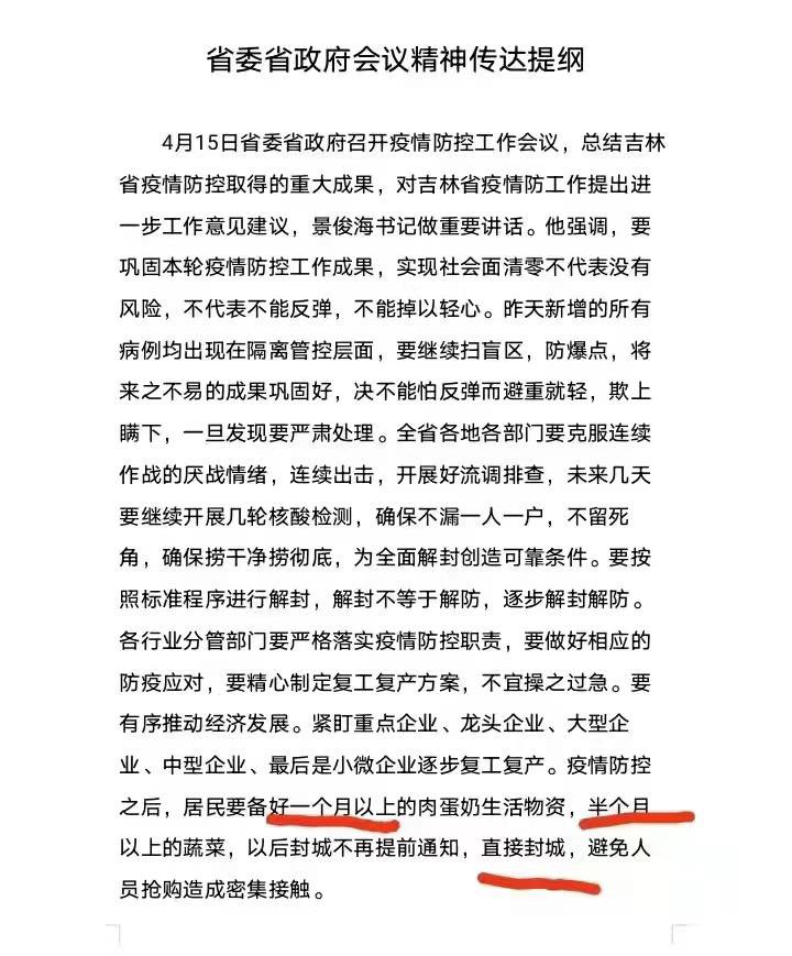 吉林省委省政府会议,以后封城不再提前通知,直接封城,避免人员抢购造成密集接触。