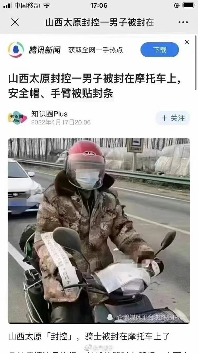 太原封控一男子被封在摩托车上。有点复古手法,画地为牢?