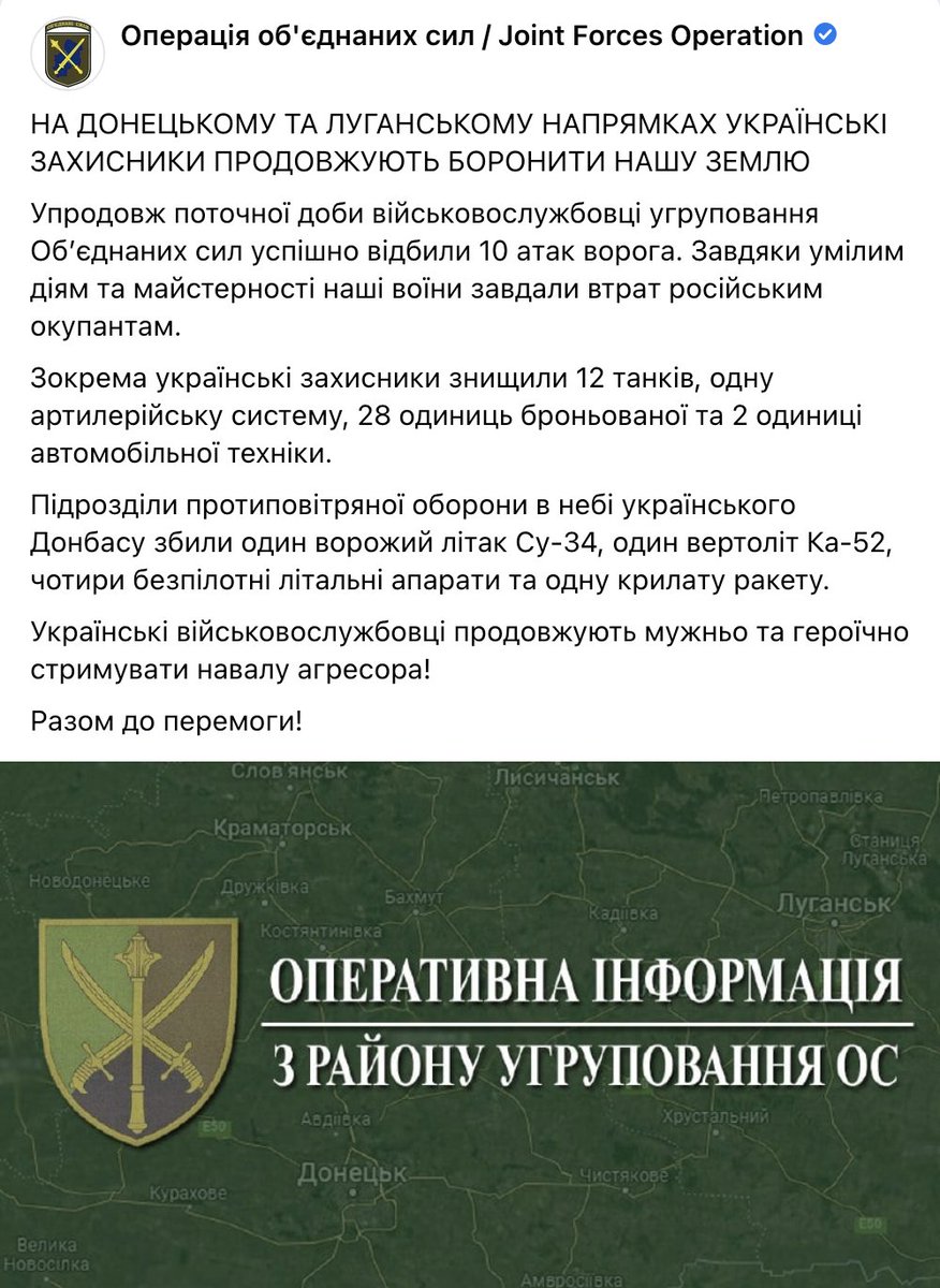 4/20. 在頓涅茨克和盧甘斯克地區,烏軍擊退俄軍10次進攻,並摧毀12輛俄軍戰車、1門火砲系統、28輛裝甲車和2輛軍車防空系統擊落 1 架Su-34戰機、1 架 Ka-52 直升機、4 架無人機和攔截 1 枚巡弋飛彈