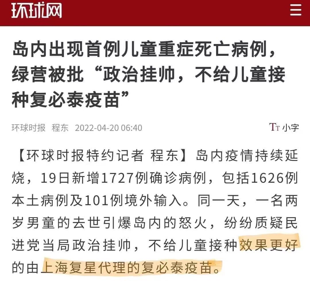 环球时报抨击台湾政府“政治挂帅,不给儿童接种效果更好的复必泰疫苗”。中国大陆不批准“效果更好的复必泰疫苗”是什么怪帅?