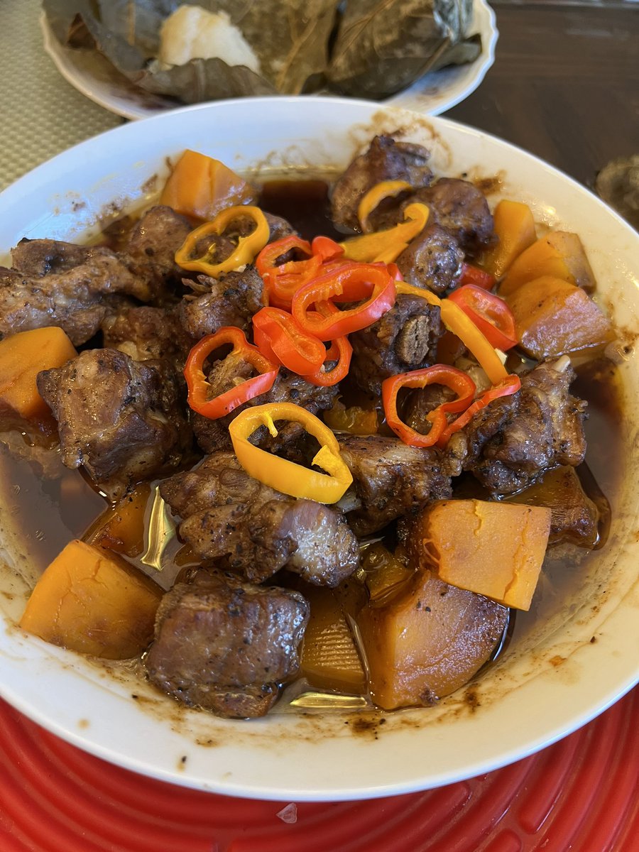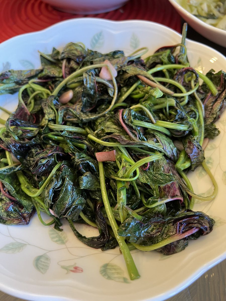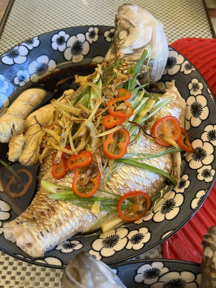 晚餐,三条大鱼,黑椒排骨,红苋菜