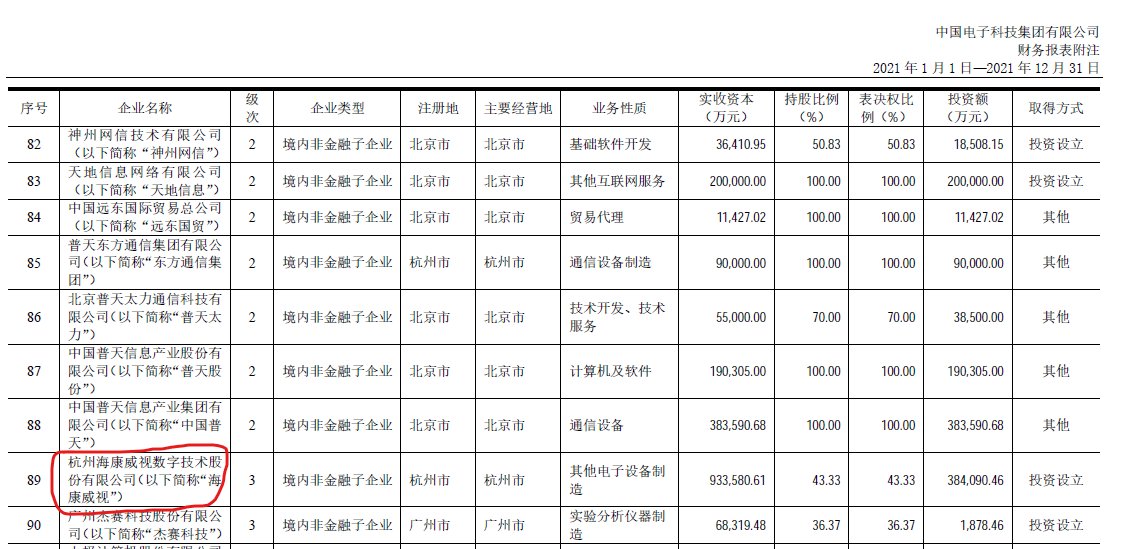 中国电子科技集团有限公司2021年经审计的财务报表证明海康威视是中共军方企业中国电子科技集团有限公司子公司。