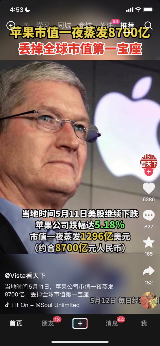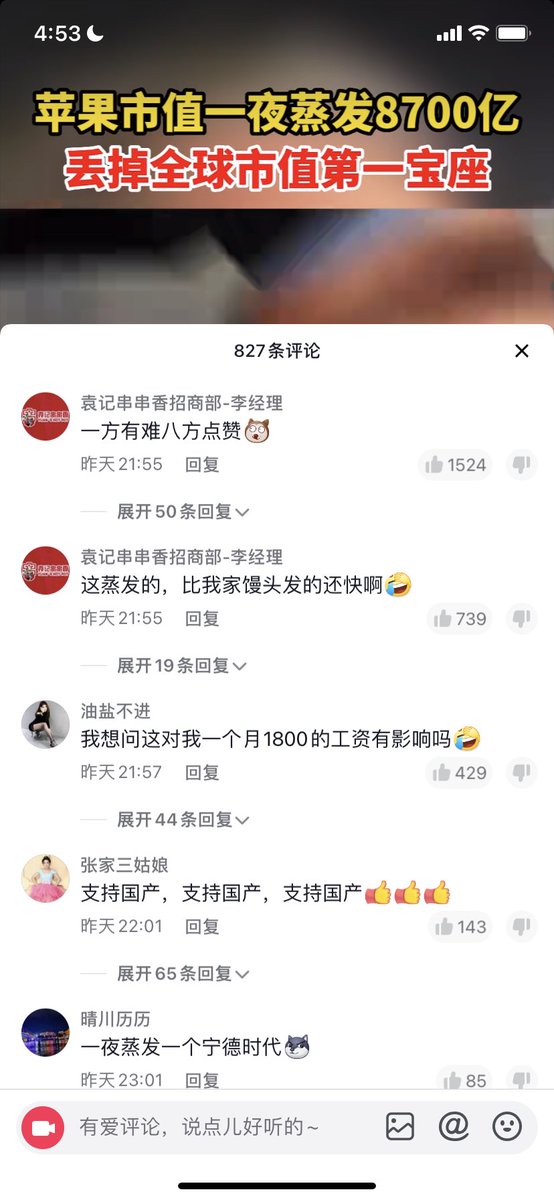 苹果股价跌了5%,疫情铁拳下的串串香经理在评论区幸灾乐祸,登顶抖音热评第一真他妈节目效果拉满