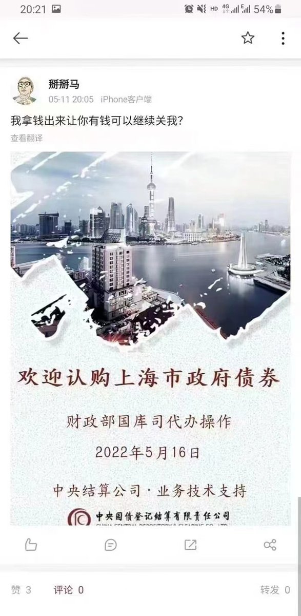 疫情似乎把上海若干官员的智商清零了、对民意的体察能力清零了。前有官员下令在民众水深火热之中搞《众志成城同心守沪——东方卫视抗疫特别节目》,被骂到流产;今有上海市政府推销国库券,被网民痛诋:“我拿钱出来让你有钱可以继续关我”?!