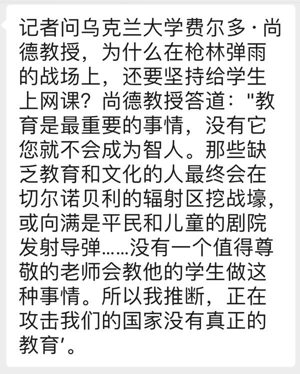 记者问乌克兰大学费尔多·尚德教授,为什么在枪林弹雨的战场上,还要坚持给学生上网课?尚德答道:教育是最重要的事情,没有它您就不会成为智人。那些缺乏教育的人最终会在切尔诺贝利的辐射区挖战壕……精彩的回答。