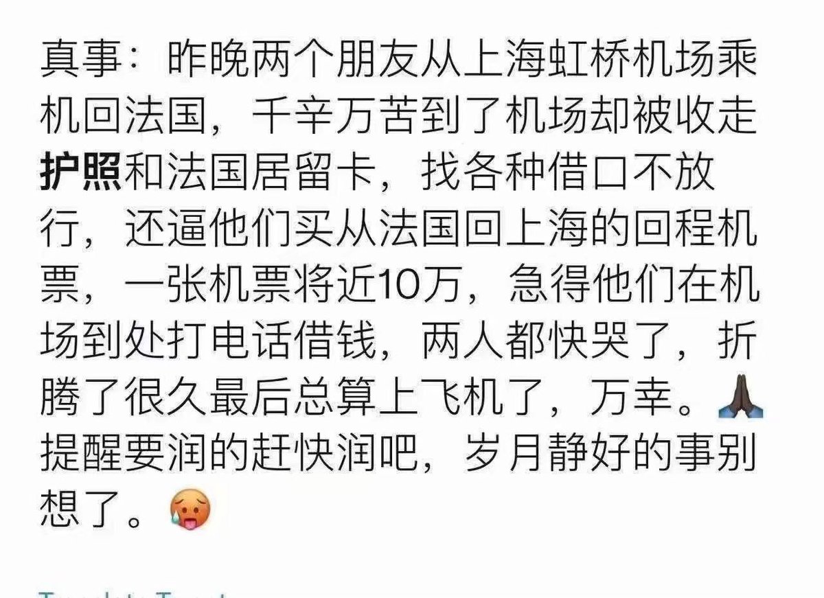 上海虹桥机场,法国居留卡的国人,被逼买10万一张的回国机票。