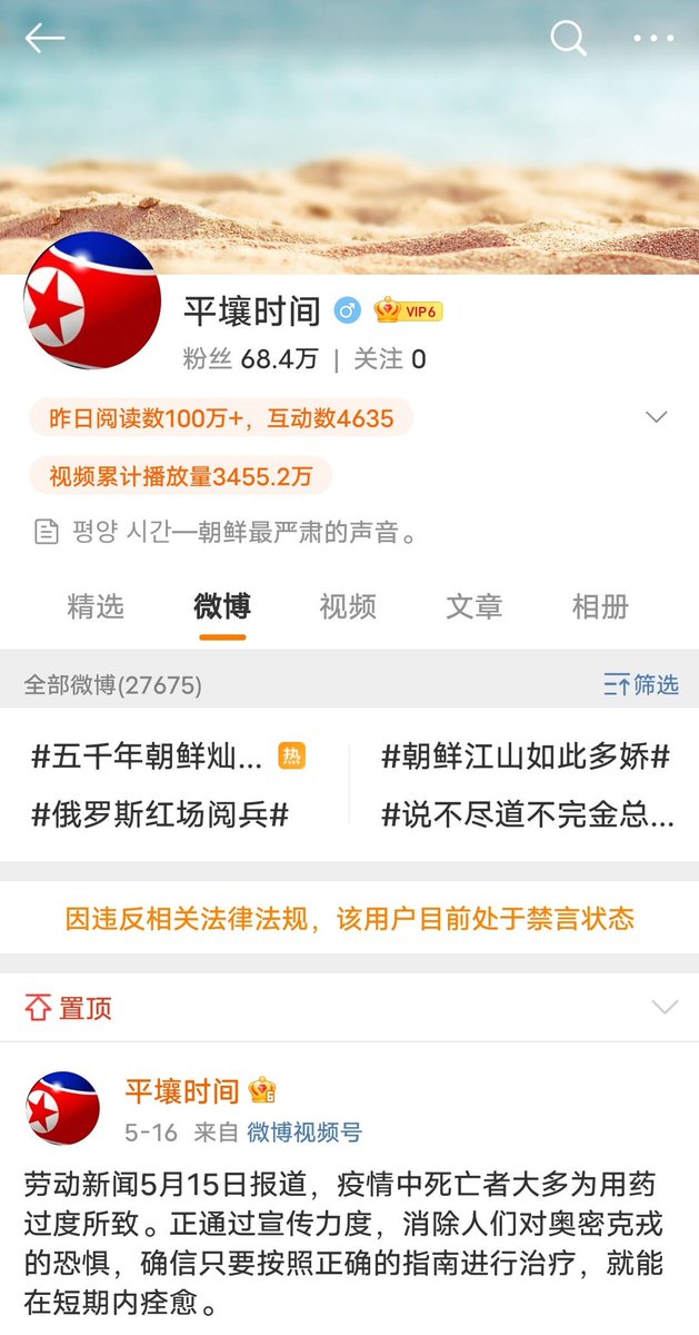 “平壤时间”这个账号一直在报道朝鲜新闻,内涵中国,更新了十几年平安无事。然而最近调侃了几句连花清瘟,呼吁大家克服对新冠的恐惧,被封号了。
