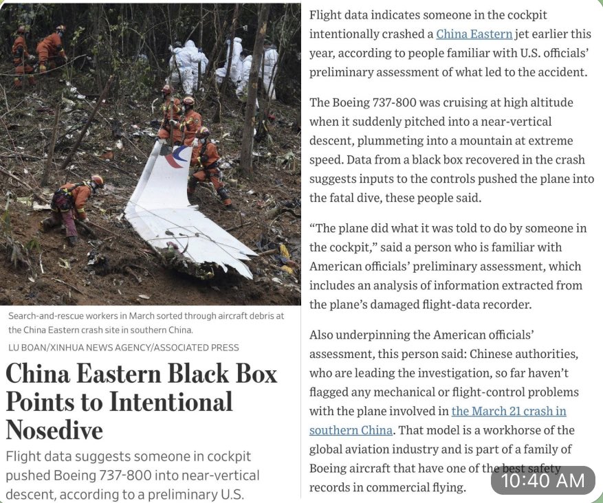 华尔街日报报道:美国交通安全委员会对黑匣子飞行数据的初步分析认为,东航坠机是人为造成的,是驾驶舱内有人设置让飞机垂直俯冲。有分析人士认为:黑匣子数据交到中国手里后,迟迟不见中国如实披露真实情况,所以借媒体透露,逼迫中国承认事实……