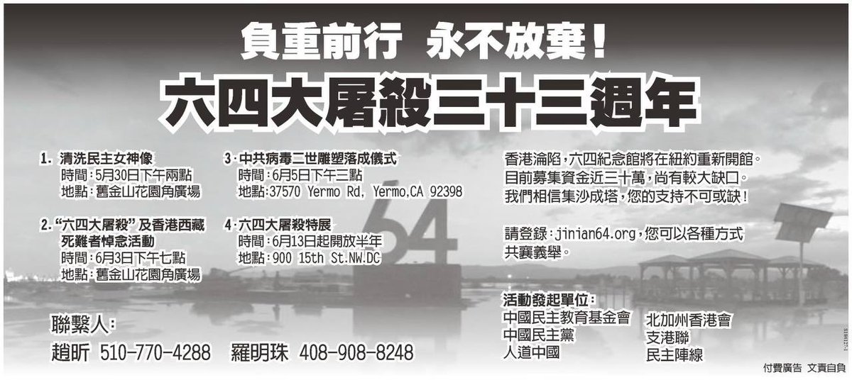 旧金山湾区纪念六四系列活动,五月三十日下午两点清洗民主女神像,六月三日晚7点烛光纪念。