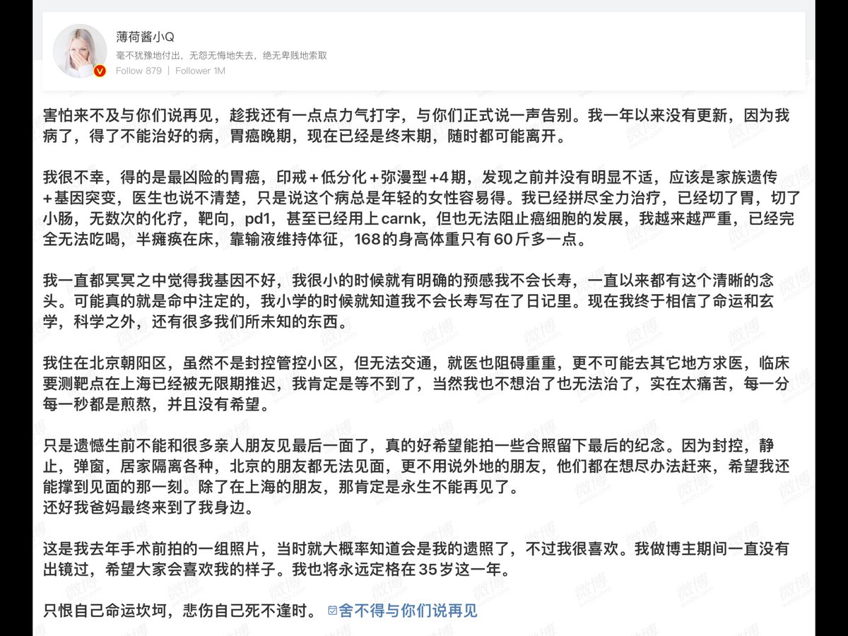 癌症晚期的博主,因为封控隔离无法继续治疗和也见不到朋友,还这么年轻生命就将这样结束