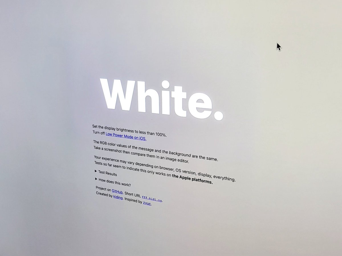 一个支持 HDR 亮度的网页,需要在支持HDR的设备下用 Safari 访问: 网页上是白底白字,颜色一样,但文字的亮度不同。