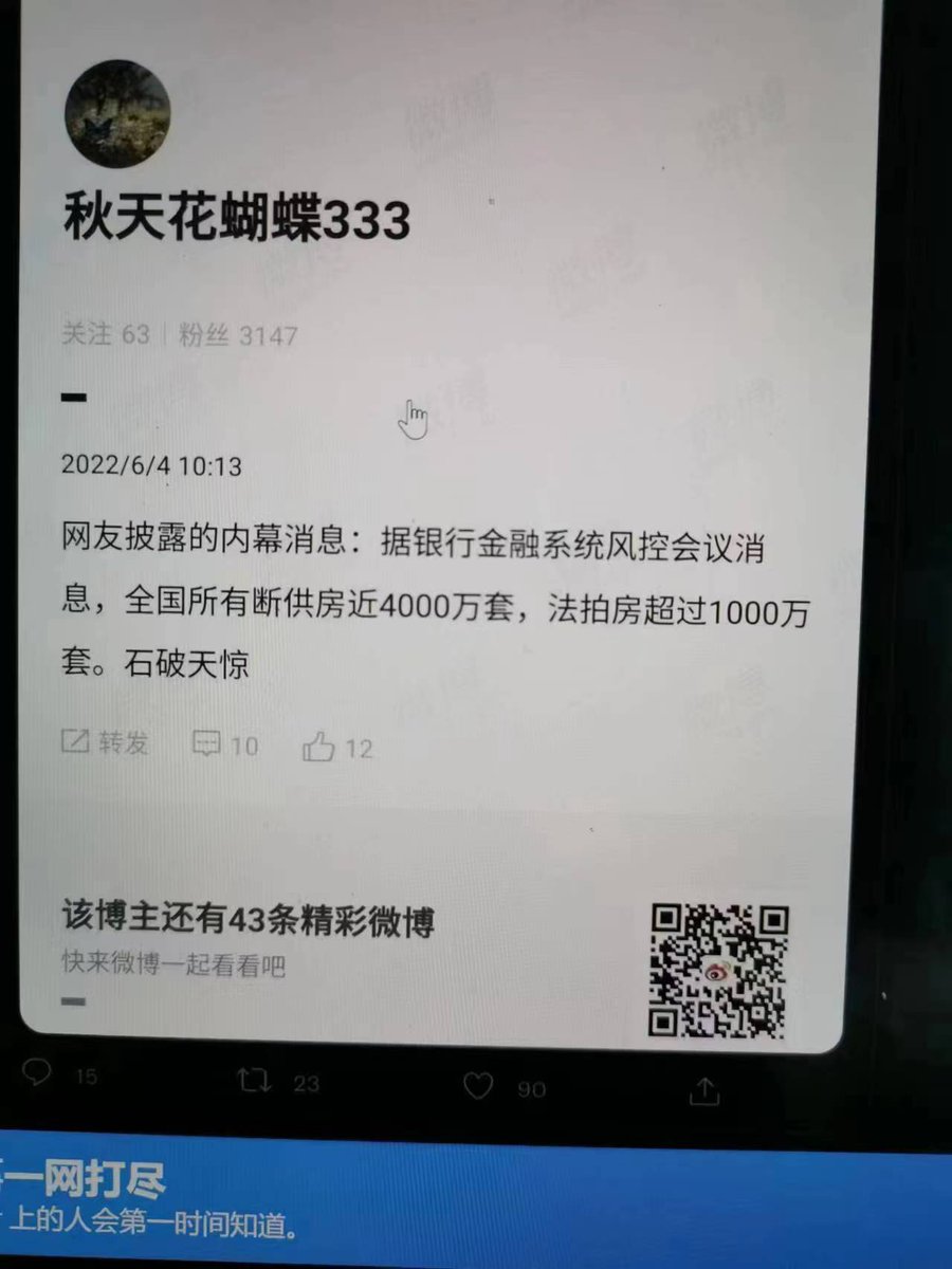 未经证实的消息:银行金融系统风控会议消息,全国有断供房4000万套,法拍房1000万套。如果是真的,那么这次大的真来了。