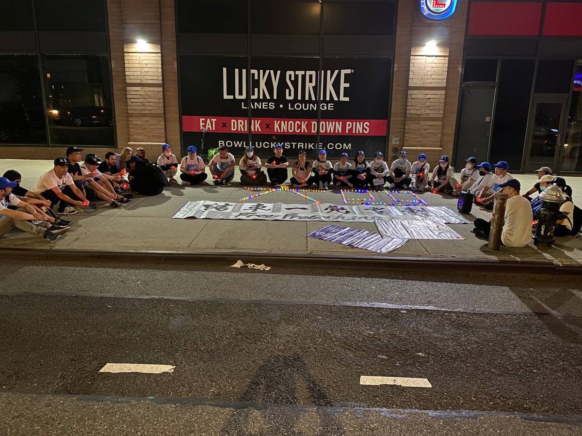 2022年6月3日晚,美国纽约中国领事馆前,28位中国民主党员和一位纽约大学的中国留学生手持烛光,为33年前怀抱同样理想而死于暴政的同胞守灵。他们面前是烛光摆出的大字“六四”和一幅标语“结束一党专制”