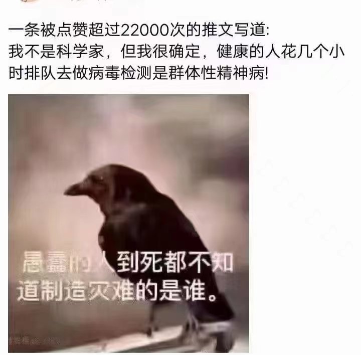 我看了后很无语,因为我也是隔两天排队去核酸检测,我也是集体精神病患者之一。