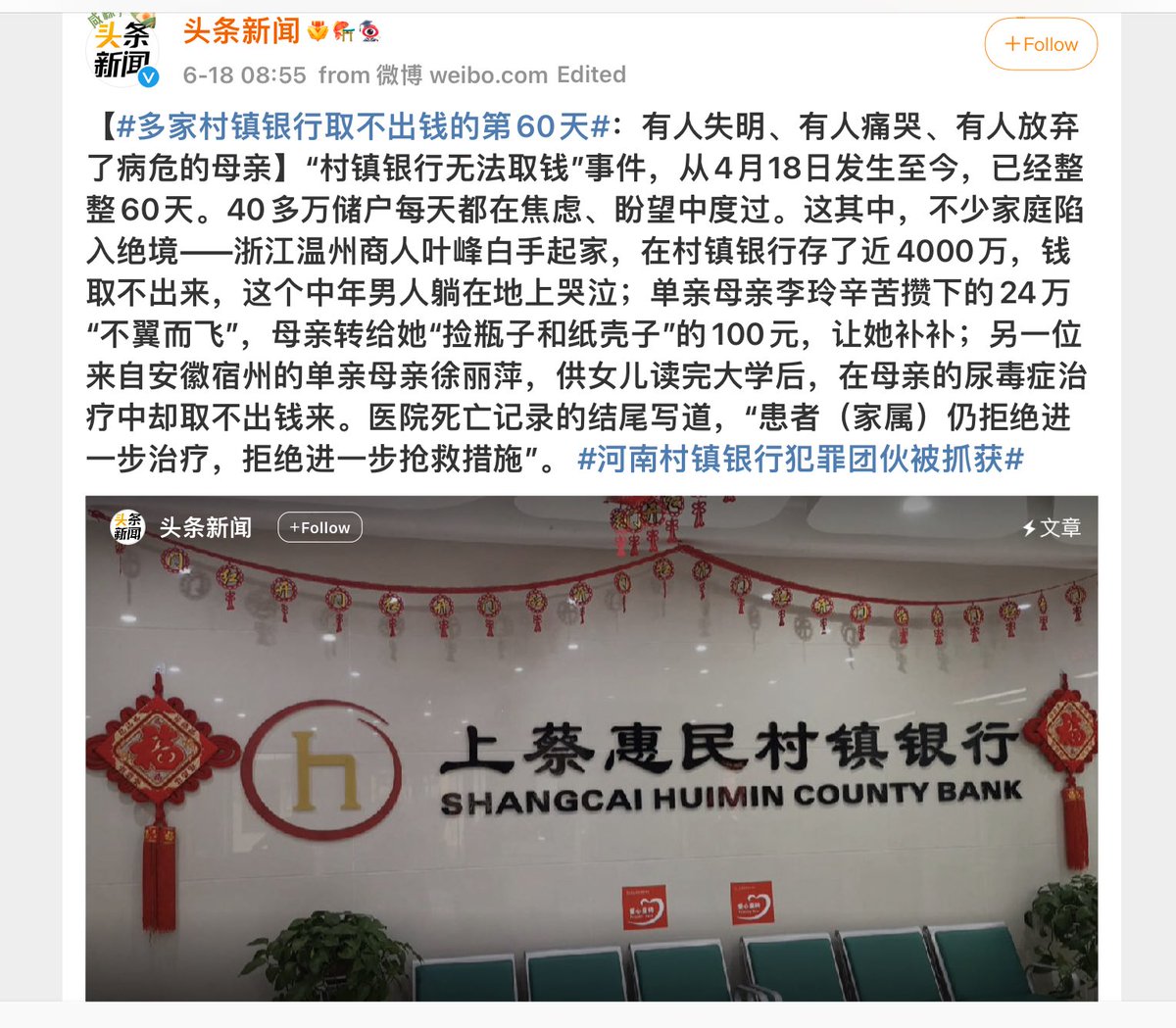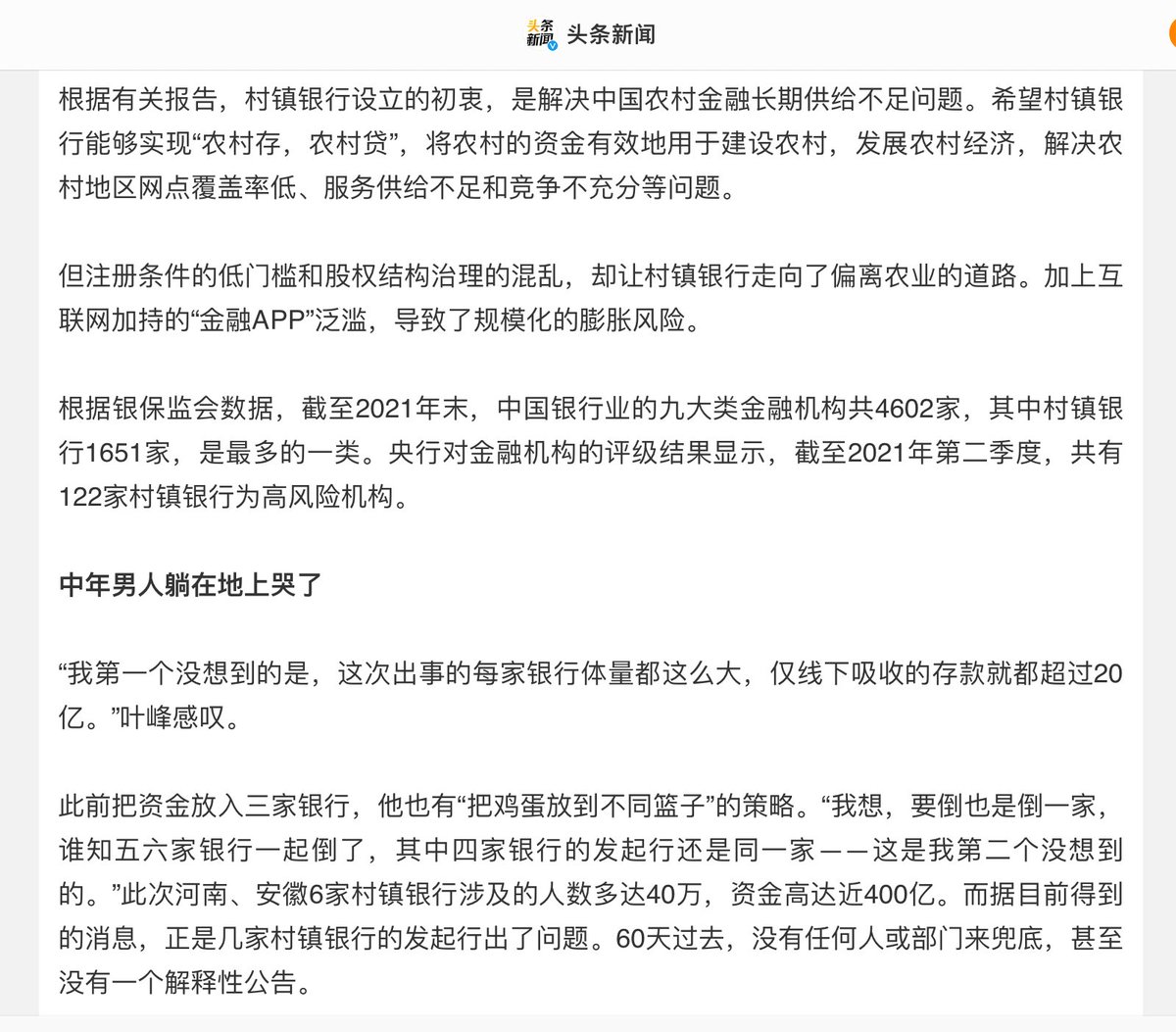 村镇银行暴雷,存款人的全部家底就这样没了。现在说抓了一批罪犯,但是款项应该很难追回了。