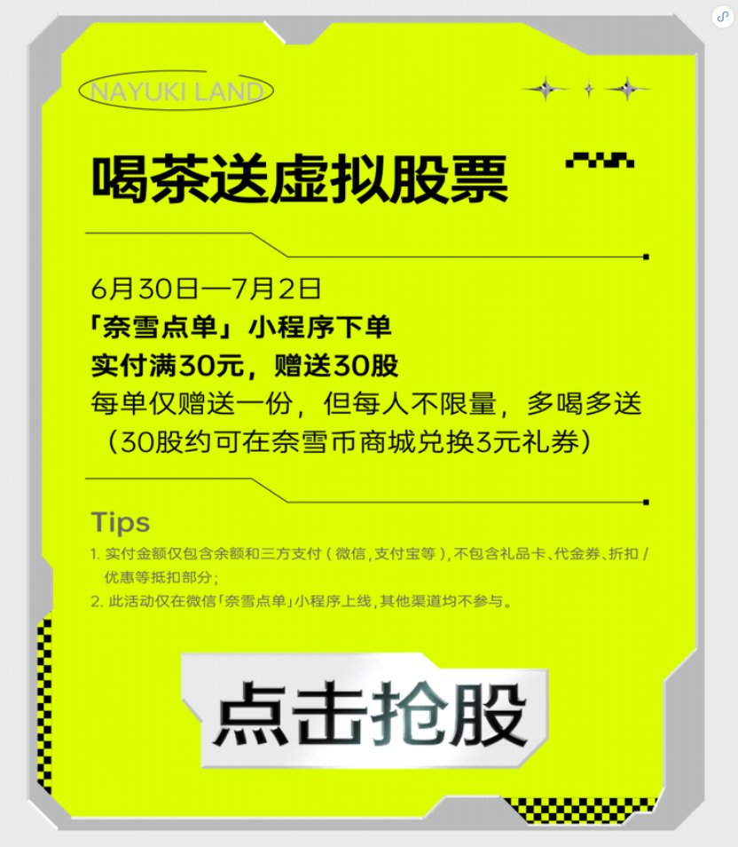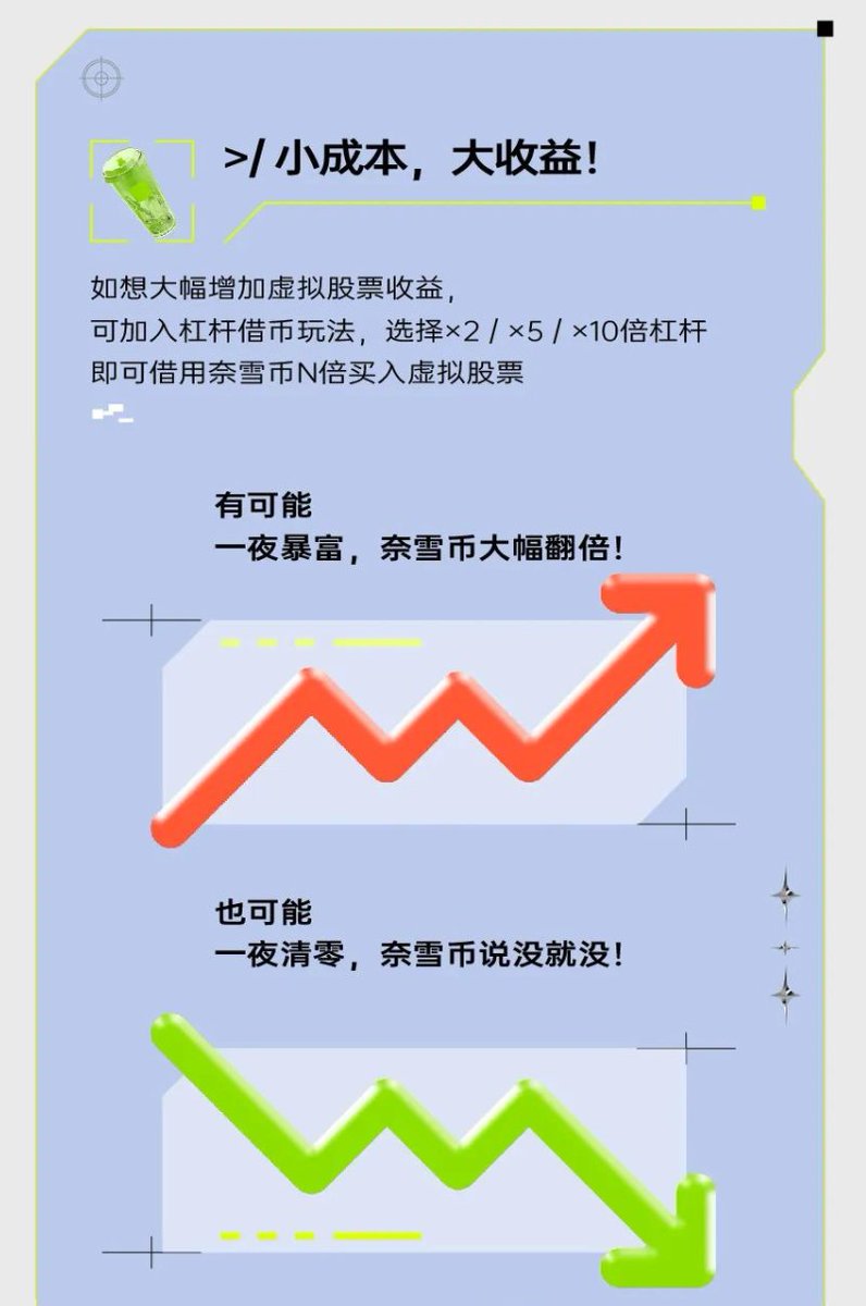 奈雪的茶上线“虚拟股票”游戏,会员通过消费获得奈雪币(会员积分)根据真实股价买入/卖出虚拟股票(以奈雪港股收盘价*人民币汇率结算)。居然还可以上杠杆,最高10倍。