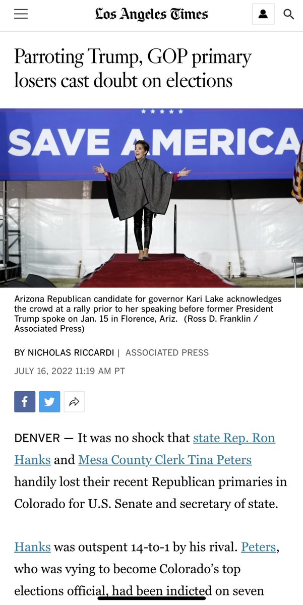 不仅共和党候选人输给民主党候选人不认输,共和党党内初选输的人也不认输,都指控选举舞弊。都是跟川普学的,共和党的新常态。