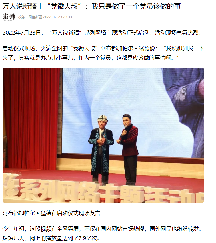 “万人说新疆”启动仪式现场,“党徽大叔”:我只是做了一个党员该干的事情。希望世界看到真实感人的新疆吧什么强迫劳动、种族灭绝啊乐吧来的谎言早日结束