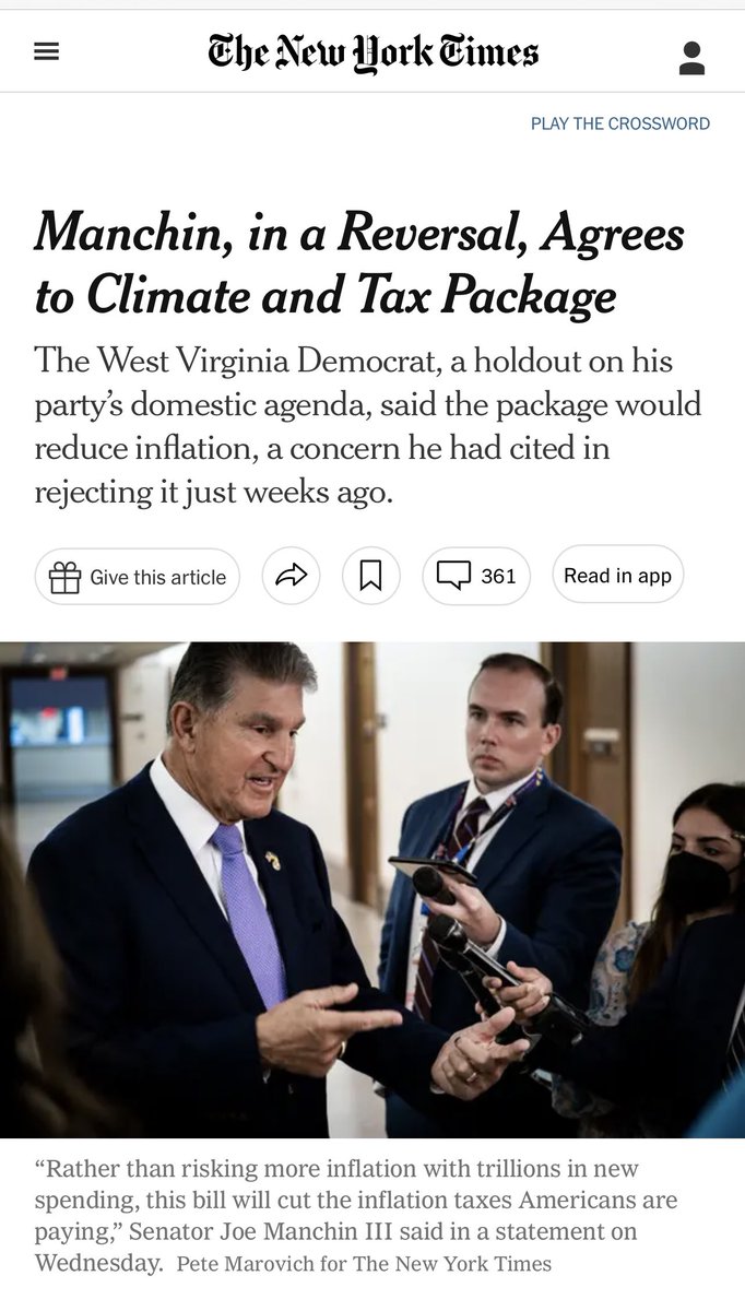 美国参议院64:33通过2800亿美元资助美国产业法案,主要是资助芯片产业,要把高科技制造业撤回美国,目的是对抗中国。大部分共和党参议员投了反对票。唯一一个反对拜登减排方案的民主党参议员今天突然宣布支持拜登减排方案,世界又有救了。